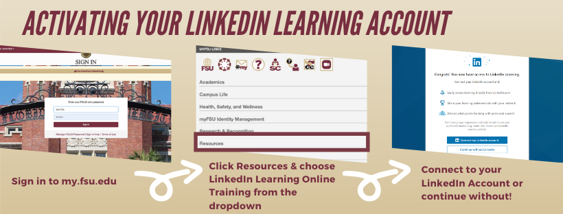 Many of the links above direct you to LinkedIn's library of learning tools. All current FSU students, faculty, and staff have free access to this resource, but if you have never used it before, you need to follow these quick instructions to activate your account: